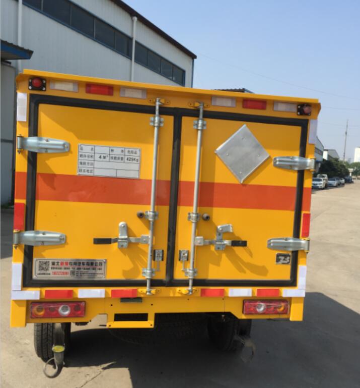 該車為危險貨物運輸車,車輛類型:EX/Ⅱ;廂體頂部封閉,不可開啟;用于運輸具有獨立包裝的黑火藥,壓縮黑火藥,硝胺炸藥,電引爆雷管,爆破炸藥,點燃導火索,類項號:1.1D,1.1D,1.1B,1.1D,1.4G,1.1 D.廂體選裝不帶下圍結構,選裝側開門.該車安裝具有衛(wèi)星定位功能的行駛記錄儀;ABS型號/生產(chǎn)廠:EV5011/博世汽車部件(蘇州)有限公司; 僅采用前盤式制動器,前置排氣管,子午線輪胎,限速裝置的底盤,限速80km/h.發(fā)動機型號及油耗值(L/100km): ZD25T5(7.6). |